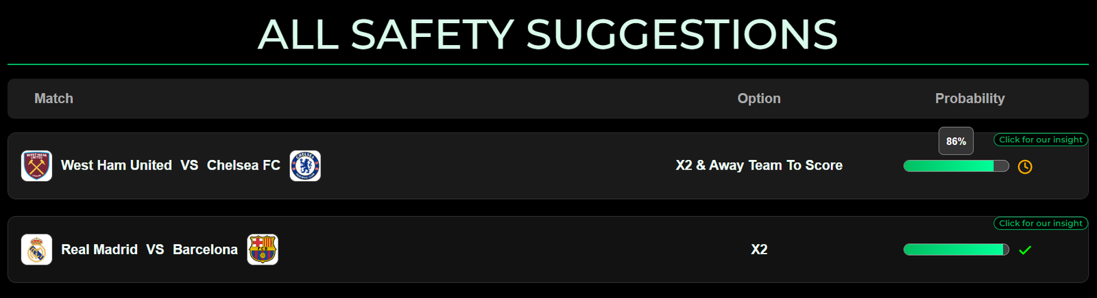 Start with Safety for steadier picks, add Moderate to diversify or Challenger for higher-odds scenarios. Each list shows the matches for that day.